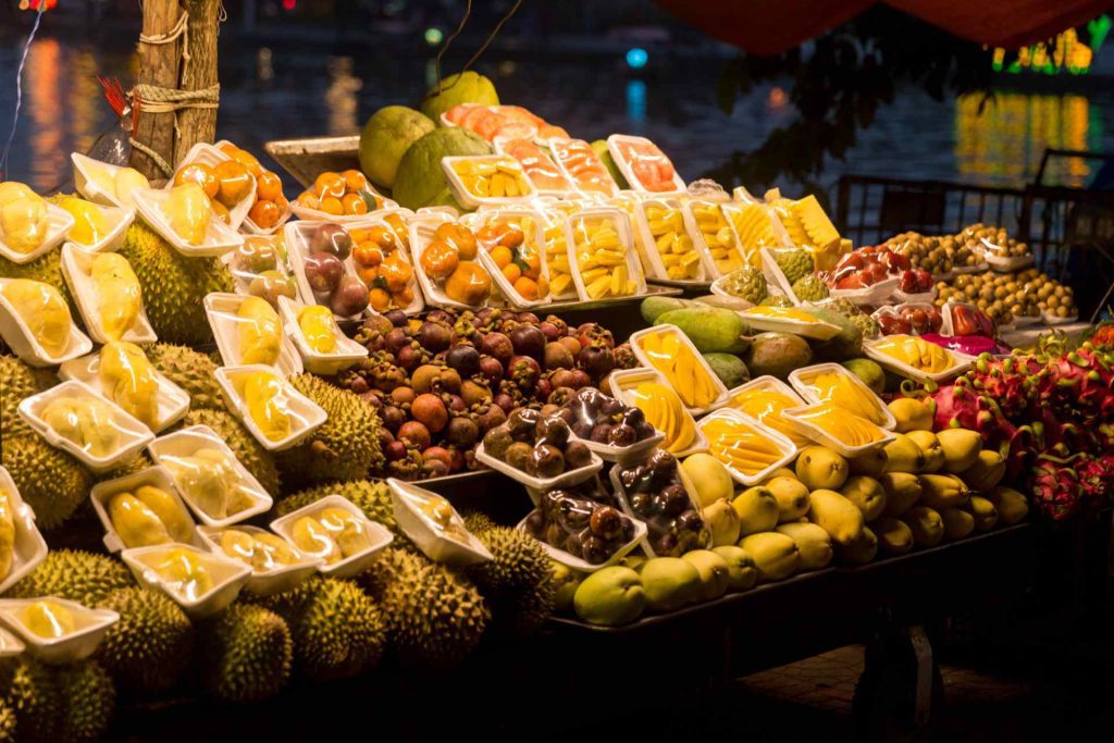 해산물 구이, 열대과일, 주스, 길거리 간식 등